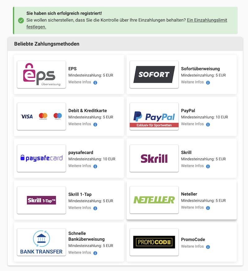 Anschließend kannst du deine erste Einzahlung vornehmen oder zur Homepage zurückkehren.