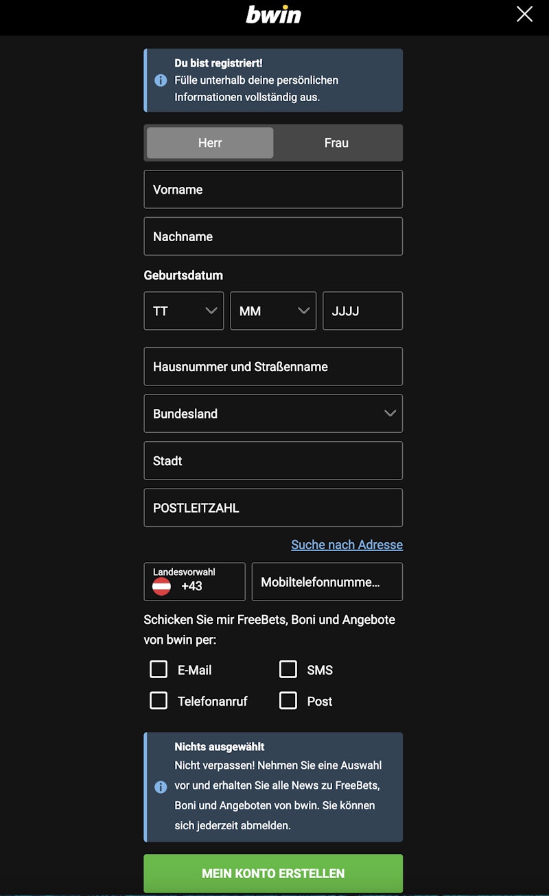 - Wähle, ob du Angebote von Bwin per Mail, SMS, Anruf oder per Post erhalten möchtest