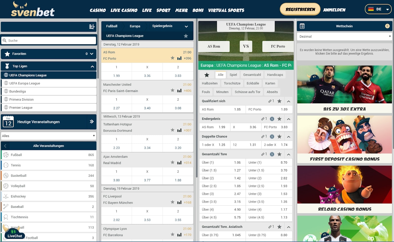 - Angebot: Sportwetten, Live-Wetten, Casino, Live-Casino, Virtual Sports, Tombola